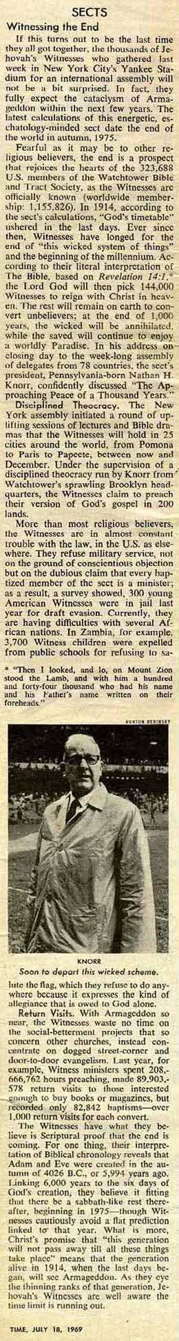Even external news sources understood the message that the Watchtower was indicating. The July 18th 1969 issue of Time contained an article “Witnessing the End” that stated;